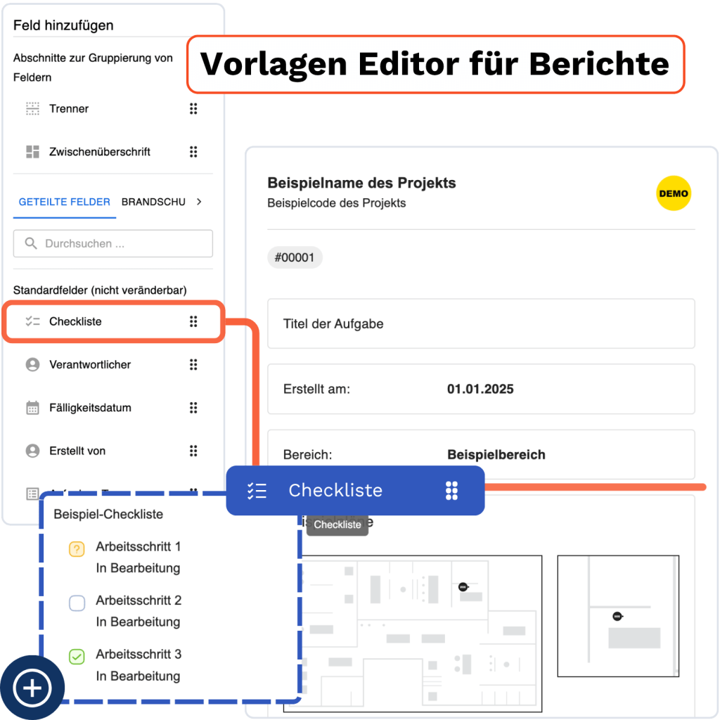 Damit es schnell geht, wenn es schnell gehen muss! Legen Sie jeweils eine Vorlage für Mängelfreimeldungen, Behinderungen oder Brandschutzberichte an. Dann einfach auswählen und sofort den richtigen Bericht in der Hand halten.