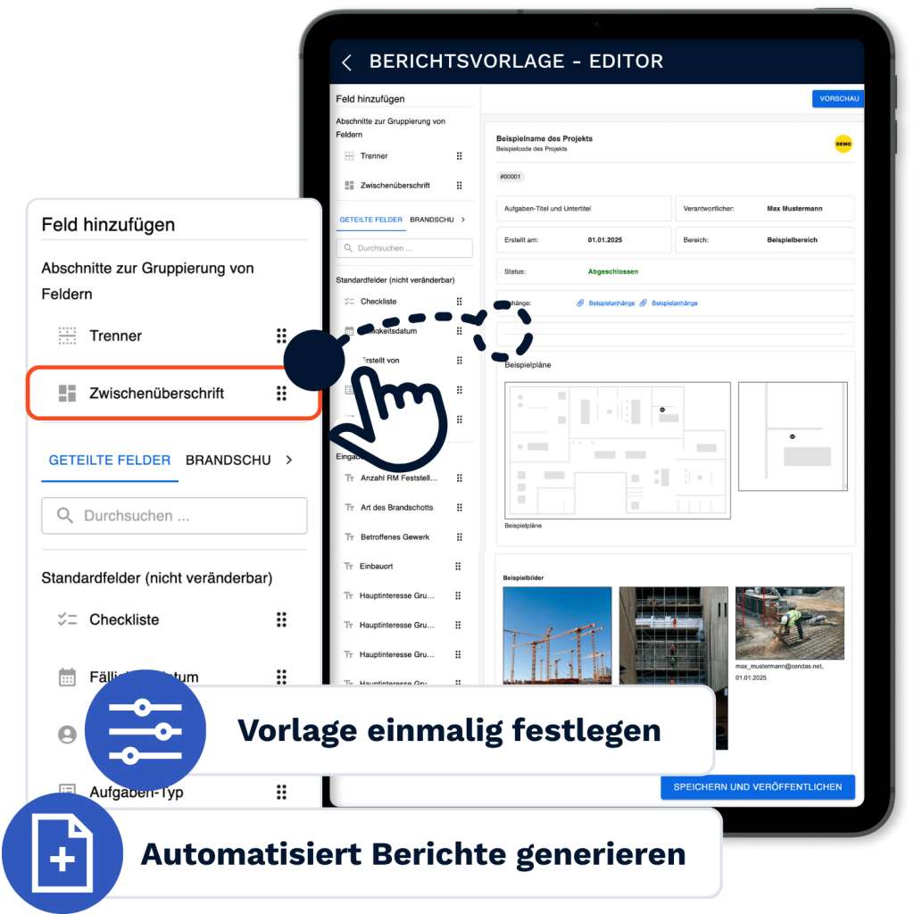 Ob Mängelfreimeldung, Protokoll oder Brandschutzbericht: mit CENDAS geht's automatisch, rechtssicher und VOB-konform.