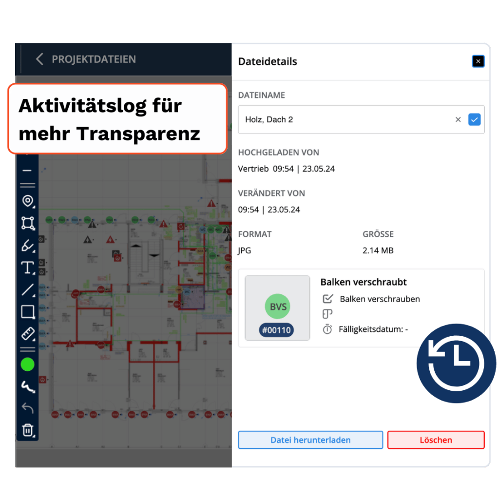 Die zentrale Dokumentenablage schafft Transparenz im Projektverlauf und unterstützt die Qualitätssicherung. Bei Nachfragen oder Streitfällen sind alle relevanten Unterlagen sofort griffbereit.