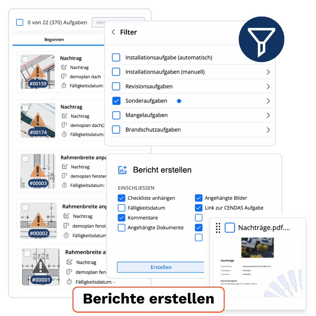 Einfach im Plan oder der Aufgabenübersicht nach Sonderaufgaben wie Nachträgen filtern. Nach Bedarf weitere Filter wie Status, Bereich, Zuständigkeit, Zeit und viele mehr anwenden.